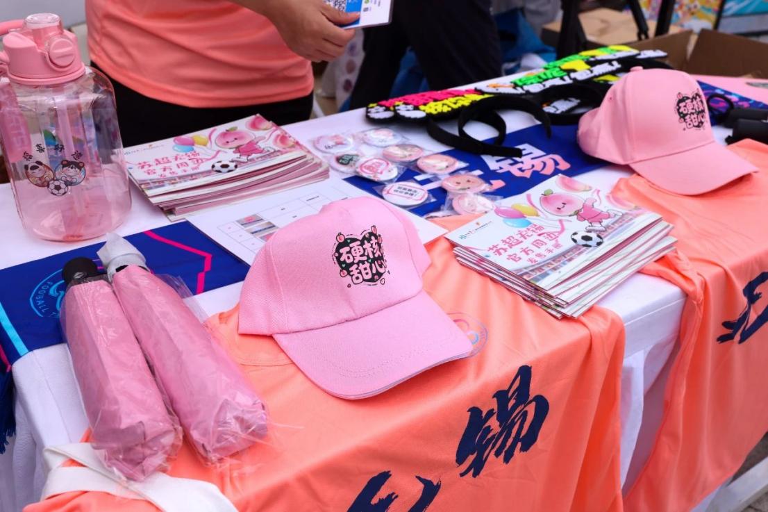 活动现场,“苏超”无锡文创产品重磅亮相。这些文创产品出自惠山区的无锡惠宁城市发展有限公司,以“苏超”联赛为灵感,融入水蜜桃元素与城市印记。从印有无锡球队LOGO的纪念徽章、足球造型钥匙扣,到绣着“有球必应”字样的蜜桃纹帆布袋,每一件都藏着对城市的热爱与对赛事的激情。