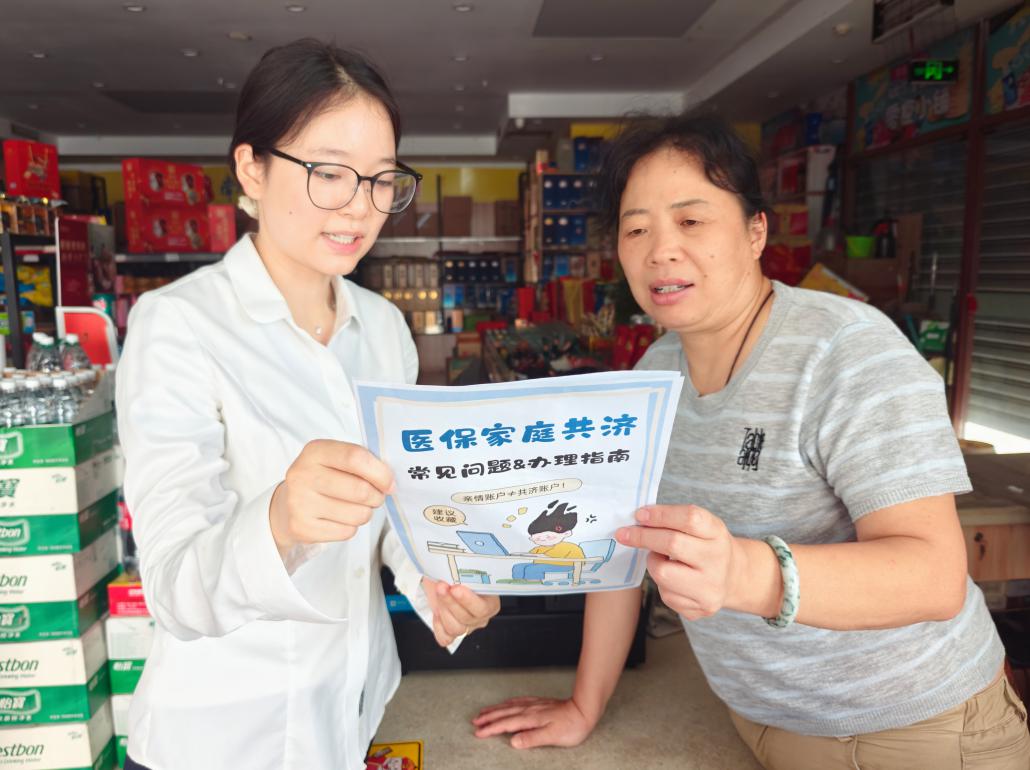 “王老板,您看,第一步先登录,第二步选择‘家庭共济’,第三步填写家人信息……手机上这样操作,医保个人账户就能和家人共享了!”在石湫的三鑫食品商行中,志愿者魏啸澜站在店主张白娣身旁,一边滑动手机屏幕,一边耐心讲解南京市职工医保家庭共济政策。小魏详细解释道:“现在您的医保账户不仅能给你老公、父母、子女用,兄弟姐妹、小孙子孙女也能用了,只要在省内定点机构,都能实现共济结算。”