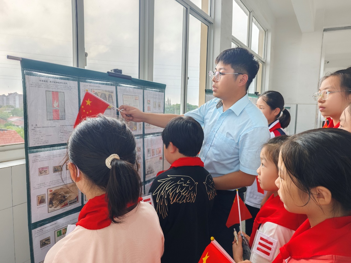 光影交错间定格金秋最美中国红。教室内,“我与中国红同框”国庆主题背景板前,学生们手持国庆主题相框,稚嫩的脸庞贴上红旗贴纸、洋溢着幸福笑容,手比红心为祖国庆生。教室外,抗战爱国主题邮票展通过方寸之间的历史印记,生动展现中华民族十四年抗战奋斗历程,那一双双回望历史的眼眸,既有对民族苦难的感同身受、也有对今日幸福生活来之不易的深切体会。通州邮政黄萍谈到:“企业参与教育实践,不仅是社会责任的体现,更是为青少年树立爱岗敬业、报效国家的现实榜样。”