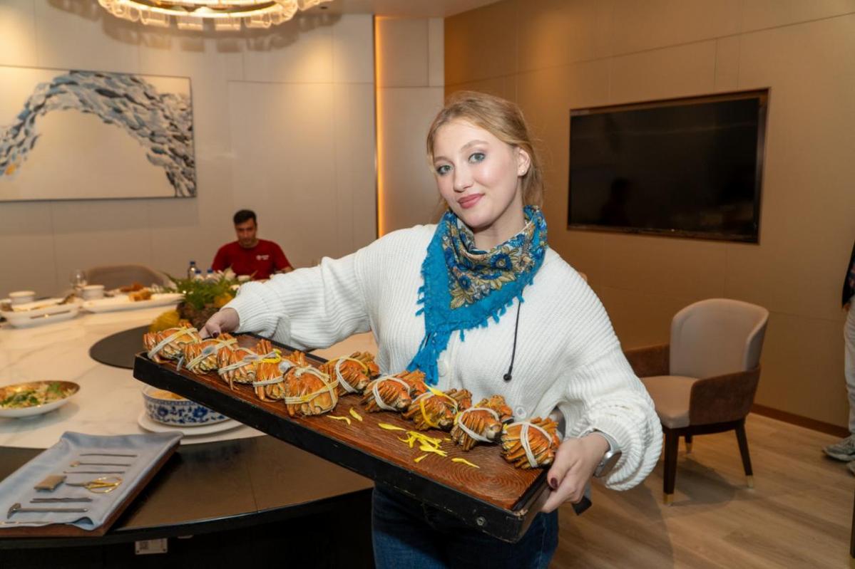 当晚,活动在阳澄湖畔的喜柯大酒店迎来温馨尾声。五位外籍嘉宾在湖光潋滟的餐厅里边赏夜景边学习大闸蟹的品尝之道。在工作人员的指导下,他们小心翼翼地拆解蟹壳,品尝金黄饱满的蟹黄与鲜甜细嫩的蟹肉。这是几位外籍嘉宾人生中第一次品尝正宗的阳澄湖大闸蟹,纷纷赞叹不已。汪澜清举着刚拆出的完整蟹腿肉兴奋地表示:“这是我人生中最美味的一餐!原来大闸蟹的鲜甜可以如此令人难忘。”