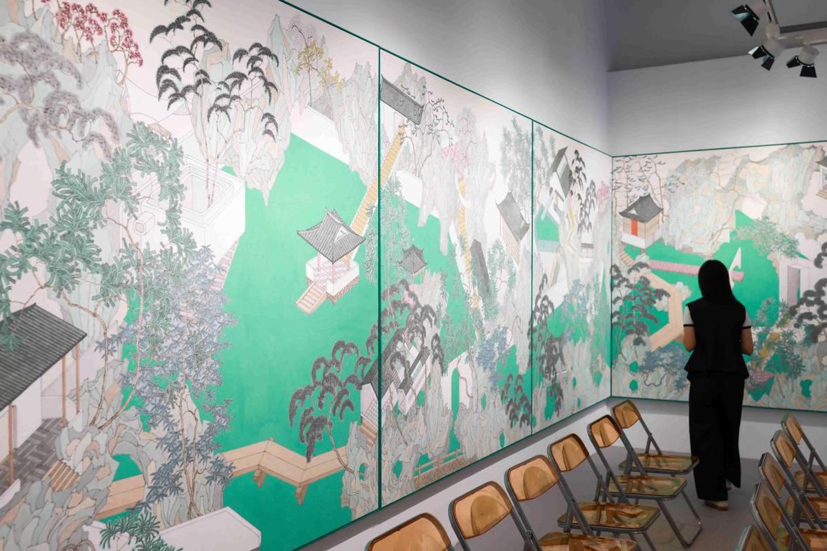 据了解,面对150平方米的空间和过往优秀展览的压力,姚永强创新性提出“一幅大画做展览”的构想,最终他以4屏2.2米高、2米宽的画作组合成一件巨作,耗时半年打磨,形成了其创作生涯中尺寸最大的园林作品——《翠影入清怀》。该作既延续了他标志性的青绿色主调与平面式构图,又注入了对园林的当代思考。