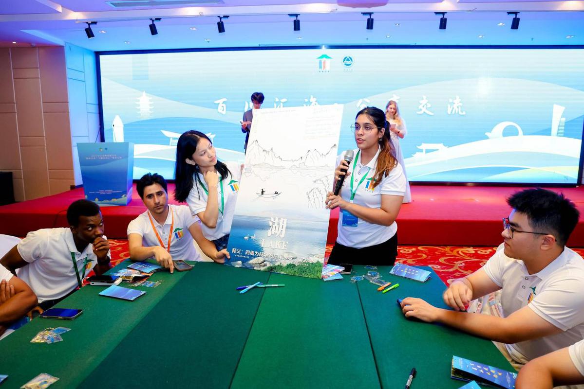 本次活动特别设置“流水知音·诗音对话”活动,成为中外文化交流的亮点。中外学生凭亚克力片拼成 “江”“湖”“清” 等水主题汉字分组,随后围绕手中汉字分享其在不同文化背景下的内涵与故事;大家通过朗诵与演唱巧妙串联,“诗” 与 “音” 搭建起跨文化沟通的桥梁,使在场留学生对汉字之美有了更为深切的感悟;“曲水流觞” 环节,同学们拿着彩笔共同在海报上进行创作,并积极分享创作灵感和趣事。“让我印象最深刻的是‘诗音对话’这个环节,我们组抽到的主题是‘江’。在活动中,我们互相学习各自国家语言里‘江’这个字怎么说,分享关于江水的故事,还以‘江’为主题画画,各抒己见创作小诗。整个过程非常有趣,让我感受到交流和创作的快乐。”南京大学印度尼西亚籍留学生张美菊拿着小组的海报说。