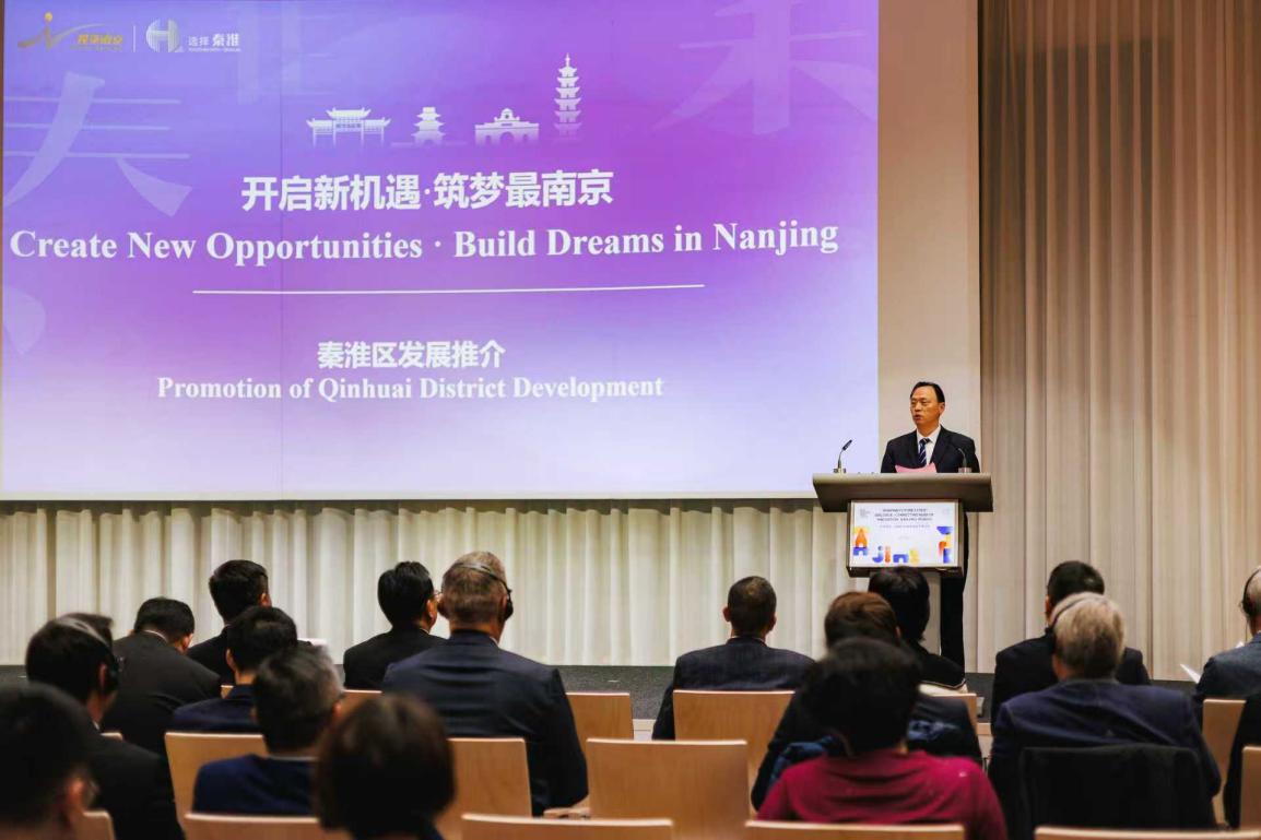 秦淮区区长凌向前展示了该区以全市0.75%的土地贡献了8.3%的GDP和38%的旅游总收入的发展成效,以及在物联网、车联网等新兴产业领域培育出的“科创雨林”生态。