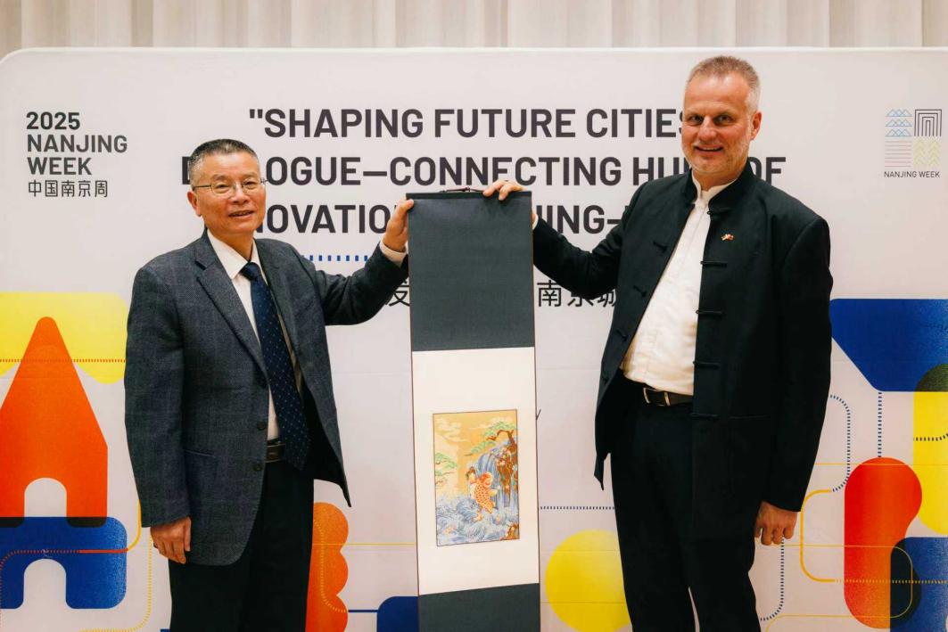 通过市区联动、板块协同,本次活动实现了“引资、引技、引才”三位一体推进,不仅强化了南京与慕尼黑的产业对接,更为构建南京对德合作生态体系搭建了关键平台。活动尾声,德中经济、教育和文化协会主席贝恩德·艾因迈尔(Bernd Einmeier)接受了南京赠予的云锦卷轴,并表示,城市交往是国际交往的重要组成部分,南京与德国城市结成了友好关系,并与德国企业共同开设职业培训等项目,这有助于两国社会加深友谊与互信。