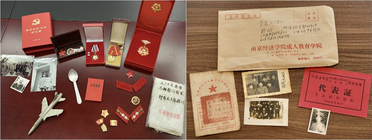 一条印有毛主席题词“为全中国人民和全世界人民服务”的白色毛巾被刘树铭视若珍宝。“这是1967年春节,中央军委派慰问团深入援越抗美前线慰问时赠送的。”刘老深情回忆,“对我们作战部队指战员来说,这是最好的纪念品。”一旁陈列的F-105飞机模型同样承载着特殊记忆,“这个飞机模型是用我们击落的美国飞机残骸制作的,当时对空作战120次,一共击落了120架这种飞机。”此外,王焕炜的党章、团员证、功劳证等,纸页虽已陈旧,却清晰印证着这段以青春守护家园的英雄往事。