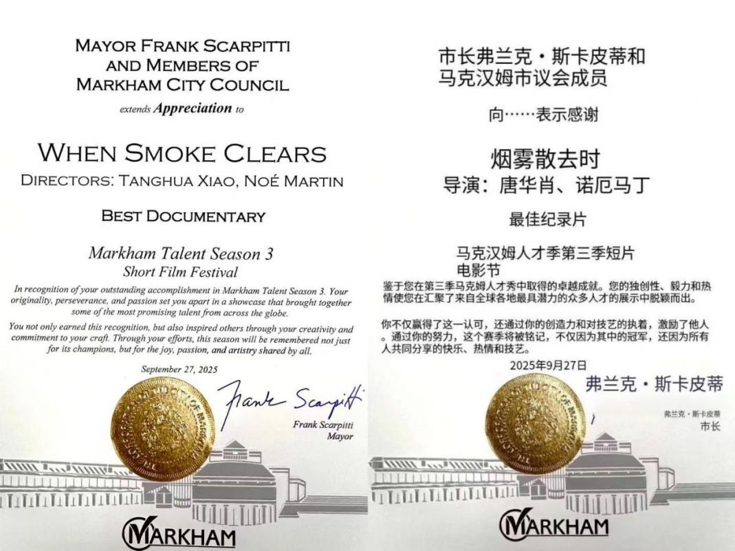 2025年9月27日,在加拿大万锦市“天才短片竞赛”中,它凭借深刻的主题与精湛的制作荣获“最佳纪录片奖”(Winner of Best Documentary, Genius Shorts Competition);